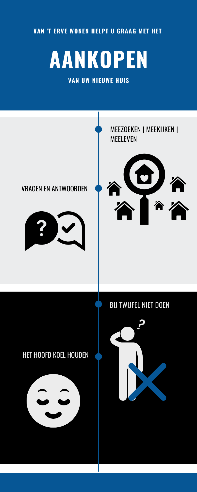 Omdat wij weten wat uw wensen zijn, kunnen wij met u meedenken in de mogelijkheden van een huis. Kan er iets gecreëerd worden om aan de wensen te voldoen? Staat de prijs in verhouding tot de kwaliteit en het potentiële woonplezier? Alleen met een gerust hart kunt u kopen. Of u koopt niet natuurlijk, want voor de aankoop van een huis geldt altijd: ‘bij twijfel niet doen’. Dan zoeken we gewoon samen verder.