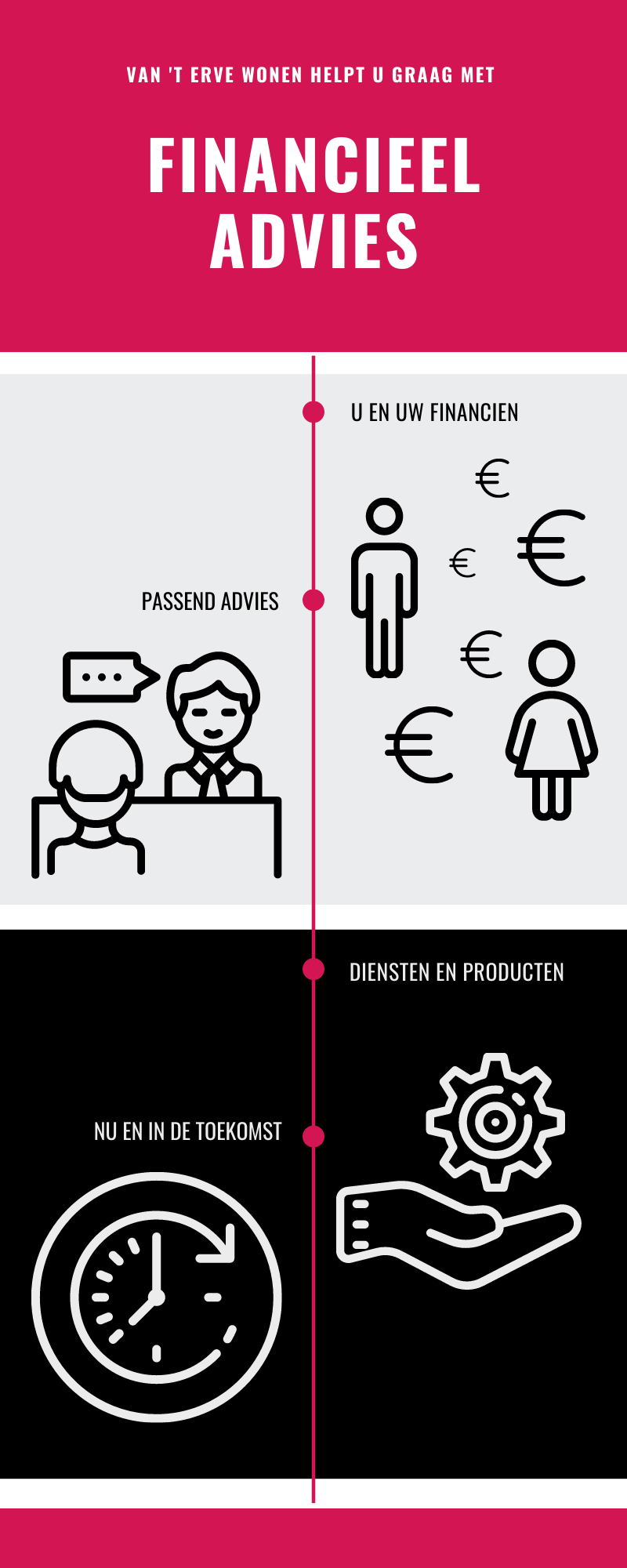 Met ons financieel advies neemt u een dienst af. Daarmee bedoelen wij dat u ons betaalt voor dat advies. De financiële producten die u afneemt naar aanleiding van ons advies, maken u rechtstreeks klant van de bank of de (verzekerings)maatschappij. Toch laten wij u na ons advies niet los. Wij hebben bijvoorbeeld een ‘zorgeloos wonen abonnement’, waarmee u wij uw financiële positie up to date kunnen houden. Heeft u vragen? Schade? Calamiteiten? Neem gewoon contact met ons op en wij zorgen voor de afwikkeling.